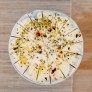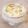 A lemon sponge baked with lemon curd, filled with geranium flavour buttercream and lemon curd, covered with a naked finish of geranium flavour buttercream and decorated with Geranium flavour buttercream rosettes, lemon curd blobs and finished with pistachio nibs and rose petals.