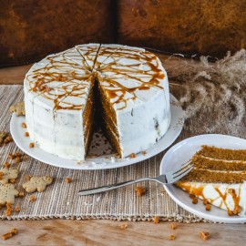 A cake base with ginger, cinnamon and nutmeg, filled and covered with soft buttercream and decorated with swirl drizzles of maple flavour caramel syrup on top.