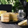 A zingly lime flavour sponge topped with passion fruit flavour icing and decorated with a passion fruit filling and cornflowers.