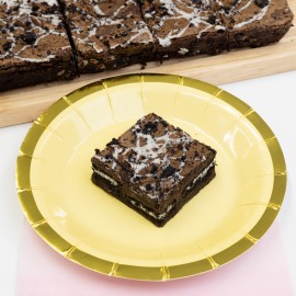 An indulgent handmade chocolate brownie topped with cookies and cream pieces and finished with a smooth cookies and cream drizzle.