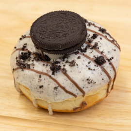 Premium ring doughnut topped with a cookies and cream glaze, Oreo biscuit, Oreo crumb and a milk choc drizzle