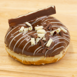 A premium ring doughnut topped with a milk and white glaze, and Cadbury Chocolate Kinder Bar pieces.