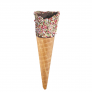 Antonelli UK Made classic single scoop tall waffle cone, dipped in chocolate coating and rolled in natural-coloured sprinkles.
